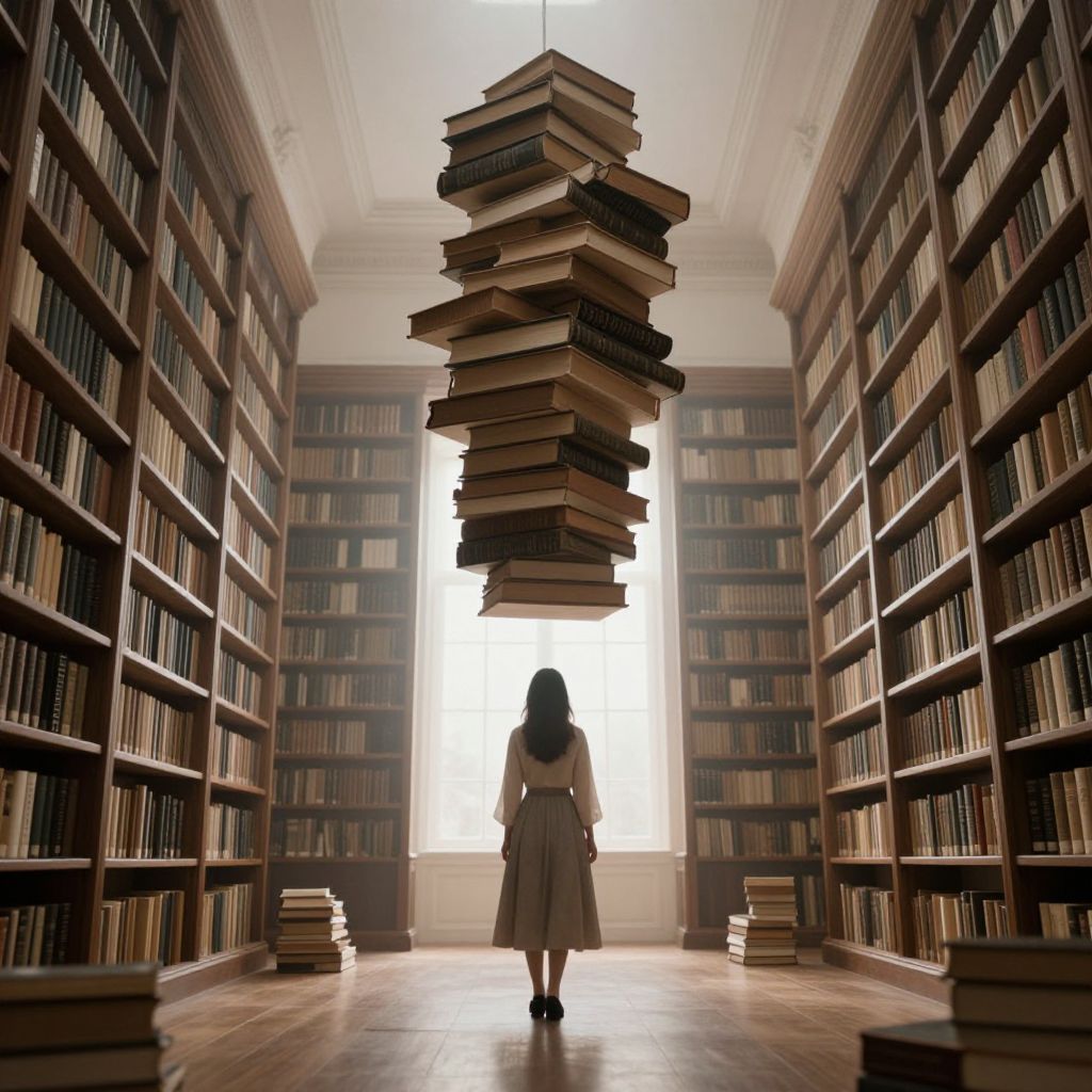 In a hushed, ethereal library, a woman stands beneath a towering stack of books defying gravity, suspended mid-air like a silent sentinel in a realm where knowledge floats freely.