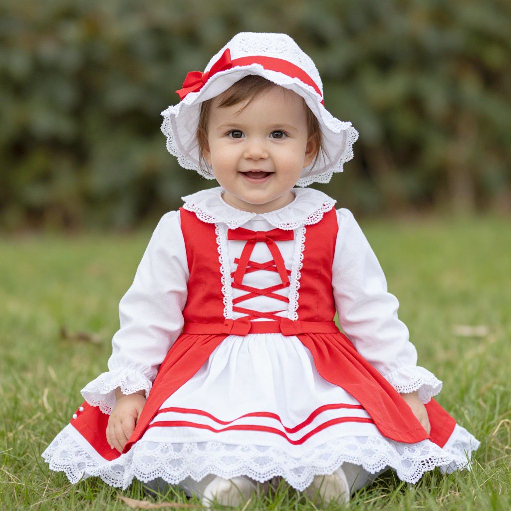 Photograph of a smiling baby girl in a red and white vintage-style dress with lace trim, red bow hat, and white lace bonnet, sitting