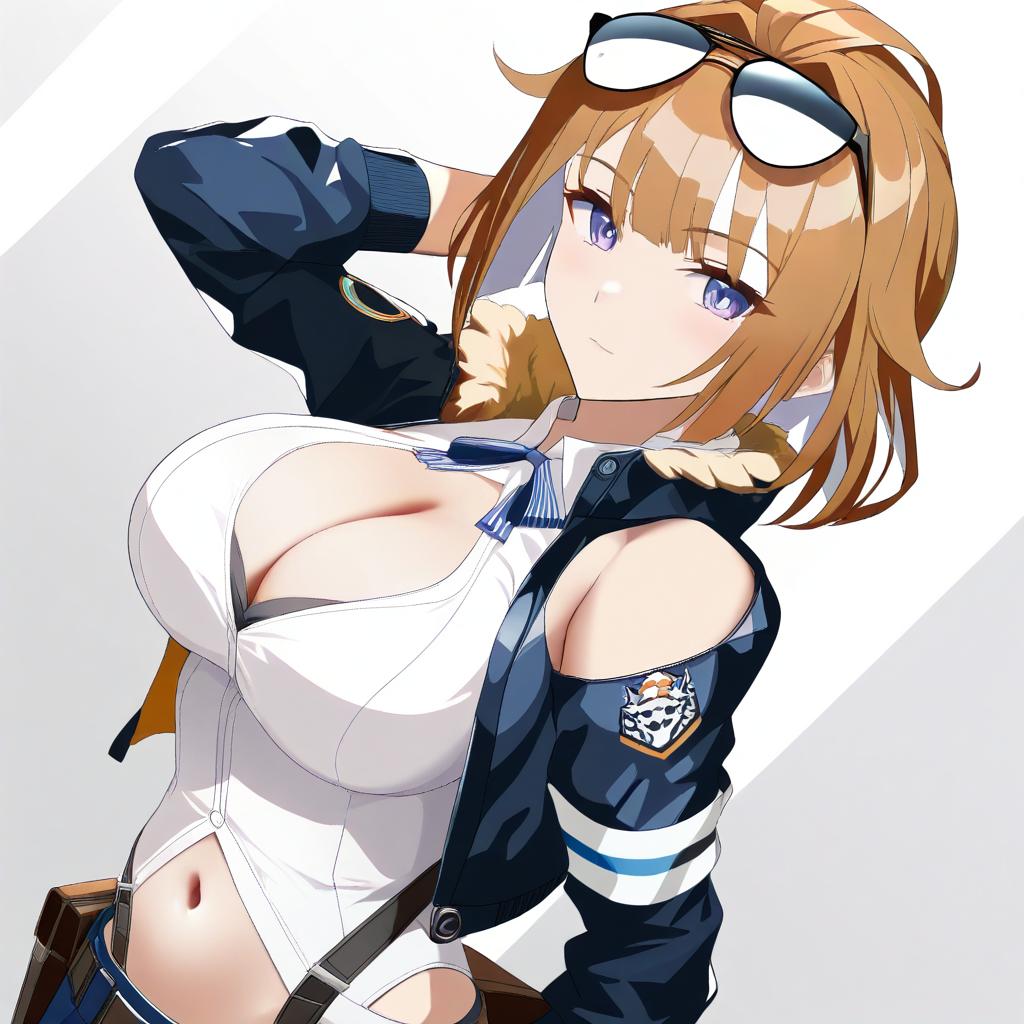Grizzly mkv (girls' frontline), girls' frontline, 1girl, purple eyes, eyewear on head, brown hair, short hair, large breasts, cleavage, navel, sunglasses, by artist eto (ikumika), animagine