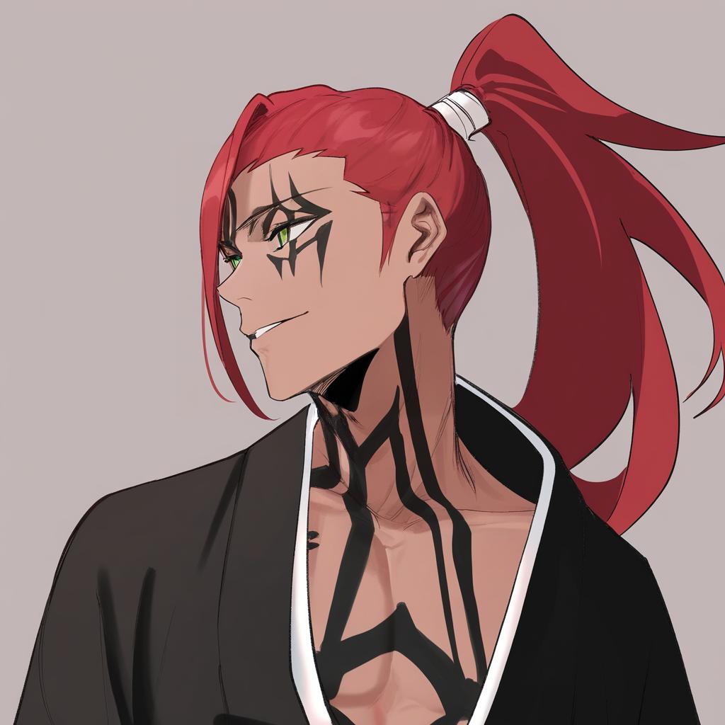 Stylized anime illustration of a male character with vibrant red hair tied in a ponytail, featuring distinctive black tattoos on his forehead, neck, and chest. He wears a traditional black kimono with a white inner lining, showcasing a confident and composed expression. The artwork emphasizes sharp facial features and a strong posture.