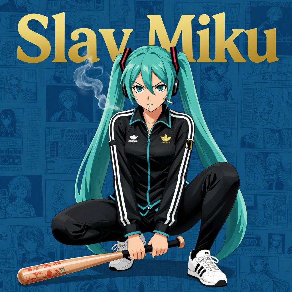 Title: Display the title \"Slav Miku\" in bold gold text, Times New Roman font main character: Hatsune Miku wearing a black adidas track suit with white stripes on the sides, and white adidas sneakers, Miku is squating, smoking a cigarette and holding a baseball bat, She is tough-looking and intimidating, looking directly at viewer visual style: bullylsf1, blue background, outline, 2d, background is wallpaper of various comic strips