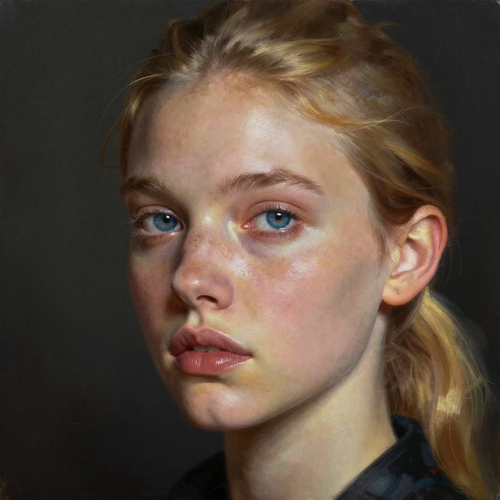 Free online art generator rendering photorealistic portraits of imaginary characters, realistic skin textures, subtle expressions, soft lighting, studio background, detailed eyes and hair, digital oil painting style, emphasizing emotion and personality