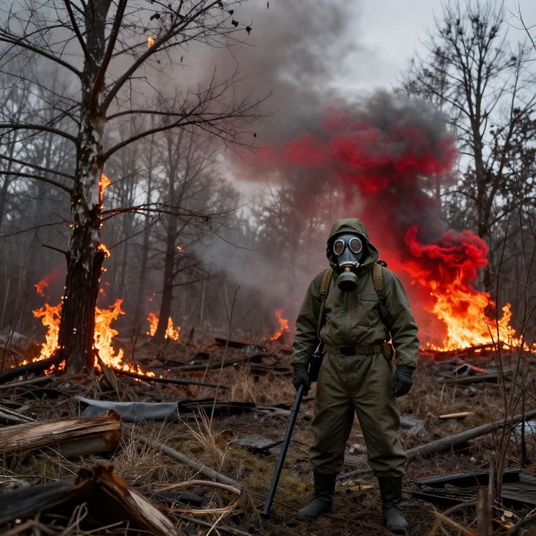 Prophecy post apocalyptic, landscape, chernobyle, trees on fire, red smoke, person in gas suit with gas mask, holding some sort of wepon, photo realistic, high detail,