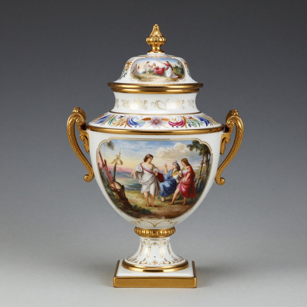 Elegant Victorian porcelain urn jar featuring hand-painted classical scenes, gold accents, and bronze handles, topped with a matching lid and finial, set upon a square base.