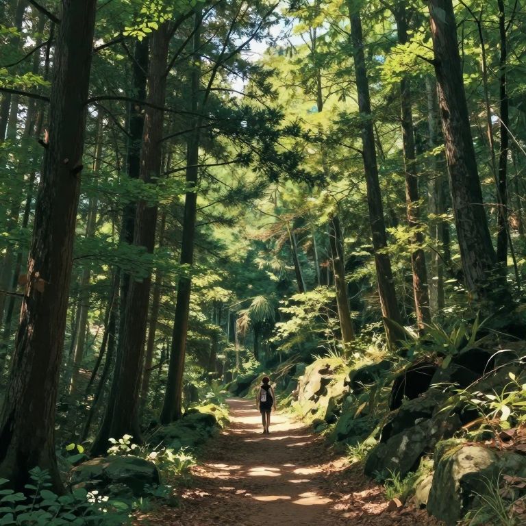 A serene forest landscape with a person walking on a path, surrounded by tall trees and rocky terrain, bathed in beautiful sunlight, evoking a Ghibli-style animation aesthetic.