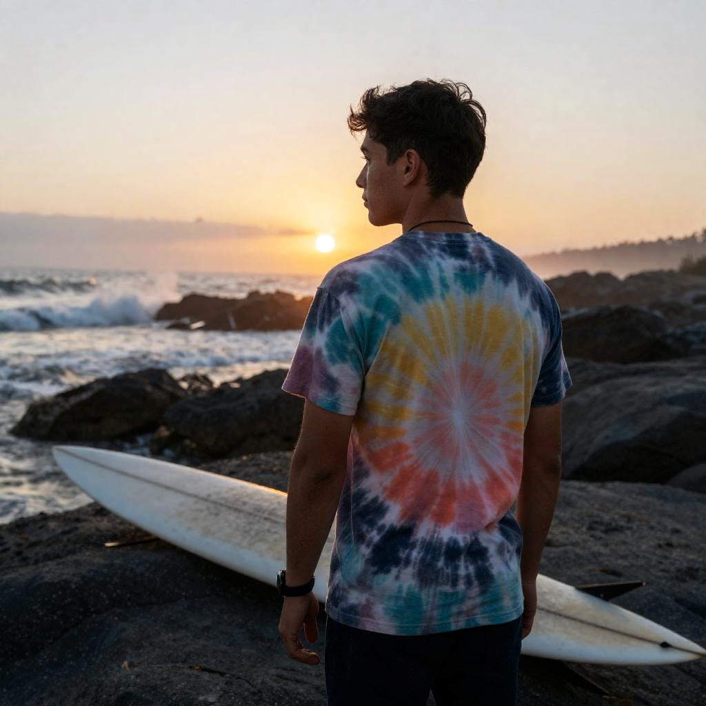 Surfer in Tie-Dye Shirt at Rocky Coastline Sunset