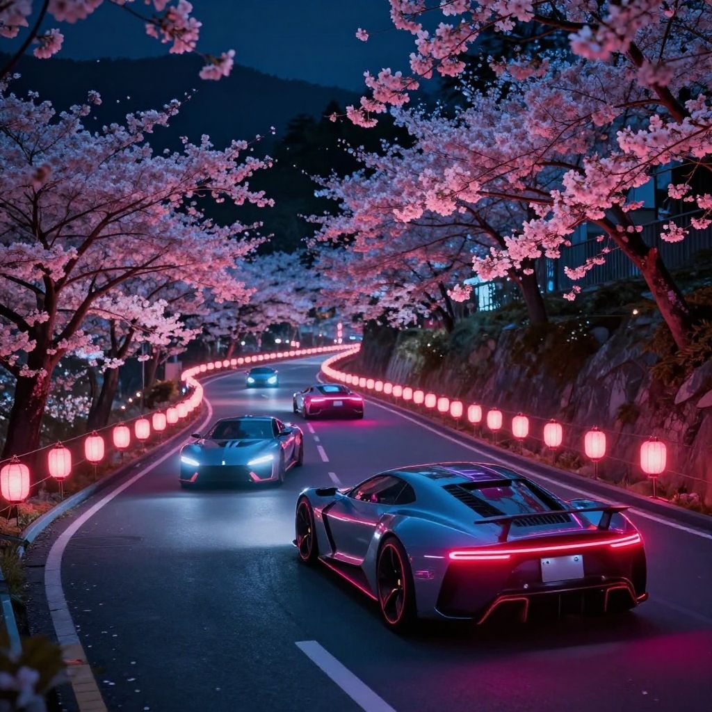 Touge in Japanese style, neon-lit mountain road at night, futuristic cars racing under cherry blossoms, glowing lanterns lining the curves, vibrant colors, cyberpunk aesthetic