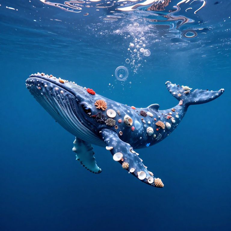 An underwater dreamscape inspired by surrealistic visions, featuring a majestic whale composed of luminous coral and seashells. The whale gracefully drifts through the ocean, its movement creating ripples that transform into swirling bubbles and abstract shapes reminiscent of melting clocks, evoking a sense of wonder and contemplation. This unique fusion of natural elements and whimsical imagination captures both the beauty and fragility of marine life in a mesmerizing visual narrative.