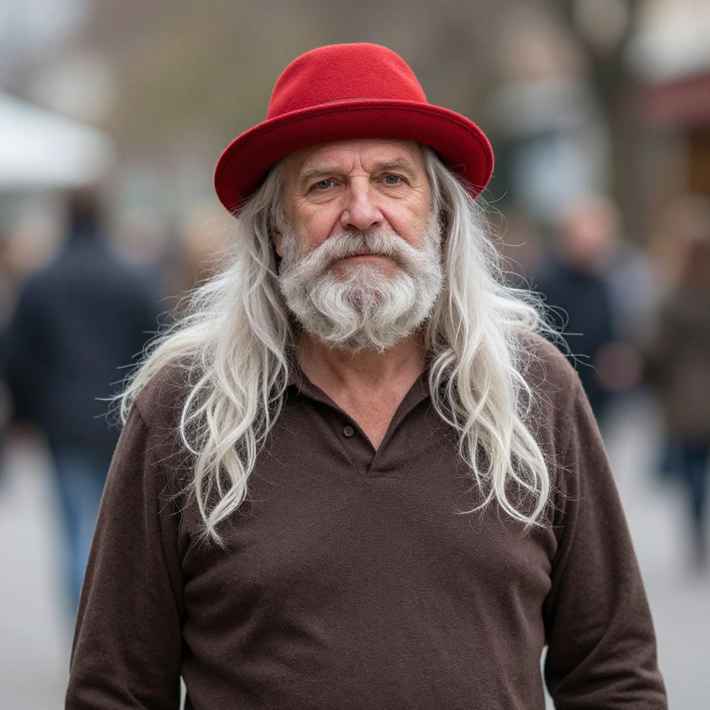 Photograph of an elderly man with a long, flowing white beard, wearing a black velvet hat and coat, set against a blurred urban background.