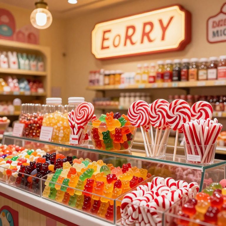 Candy store aesthetic with vibrant pastel colors, shelves filled with assorted sweets, vintage jars, whimsical lighting, cozy nostalgic atmosphere, soft focus