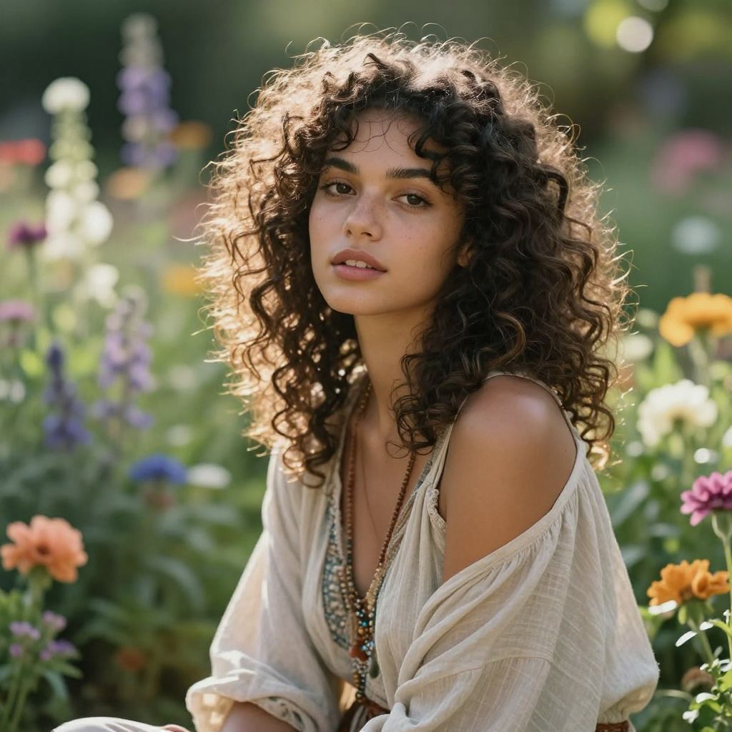 A young woman with brown curly hair and warm brown eyes is wearing a relaxed drawstring top made of soft cotton, the drawstring tied just above her chest, sitting on a wooden porch at sunset with golden light filtering through the trees in the background.