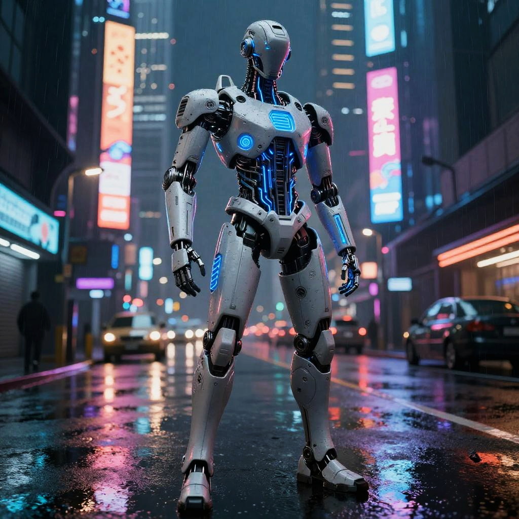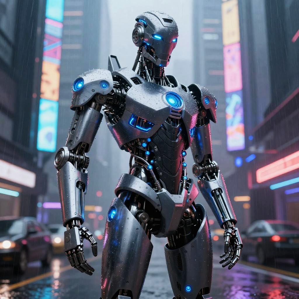 Cyberborg standing in a neon-lit futuristic city, intricate mechanical limbs glowing with blue energy, dark armored plating mixed with sleek chrome details, rain reflecting colorful holograms, cinematic cyberpunk atmosphere, high detail