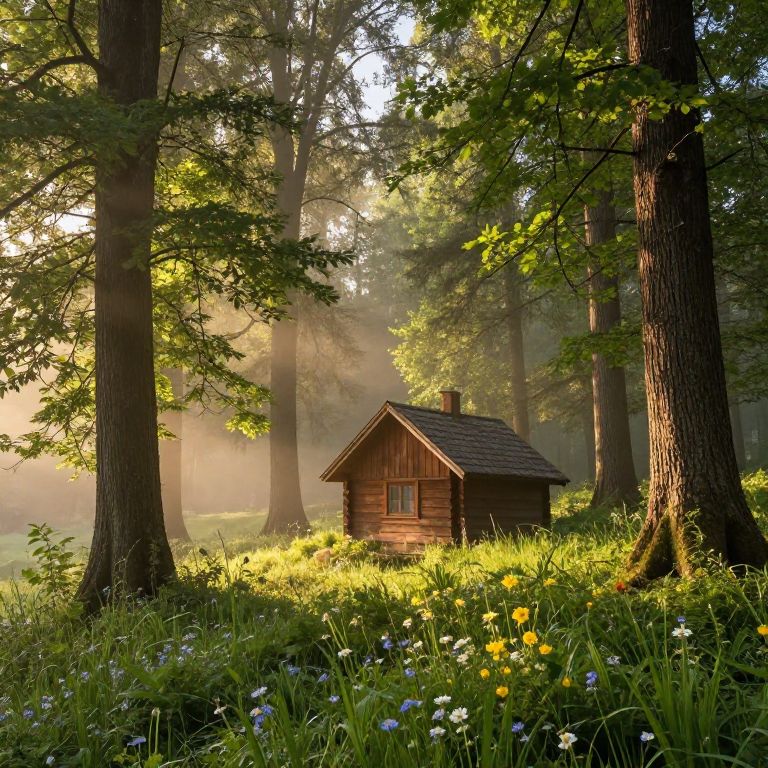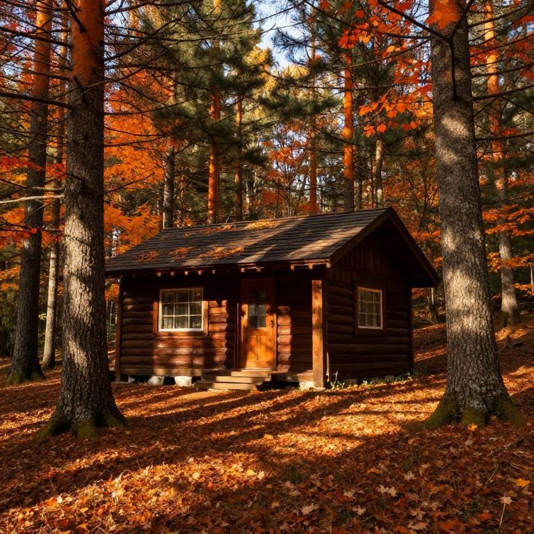 Rustic cabin nestled among towering spuce trees in autumn, colorful leaves scattered on the forest floor, warm orange and brown sunlight casting long shadows, cozy and inviting scene with vivid natural detail and textures.