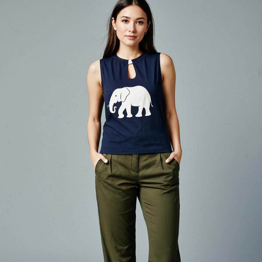 Woman, casual, sleeveless navy top with white elephant print, keyhole neckline, straight-fit olive green trousers, no visible accessories.