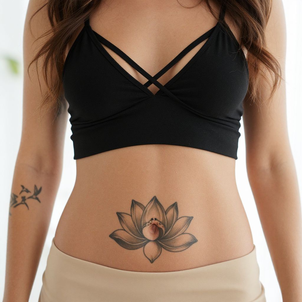 Photograph of a woman with light skin and long brown hair, showing her midsection. She's wearing a black, criss-crossed crop top and a beige skirt. She has a large black lotus flower tattoo below her navel, a belly button piercing, and a tattoo of birds on her right arm. The background is bright and blurred.