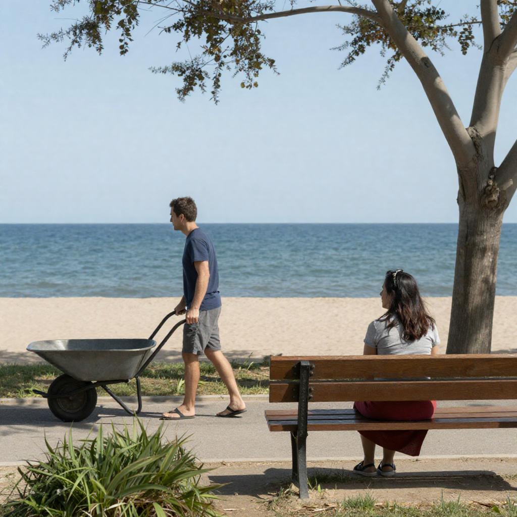 Photograph of two people walking down a grassy, rocky path. Both wear casual clothing: one in blue, the other in green. They face away from the camera, looking at a rocky coastline. Sunlight casts shadows on the path. Green grass and rocks frame the path on both sides. Ocean visible in the background.