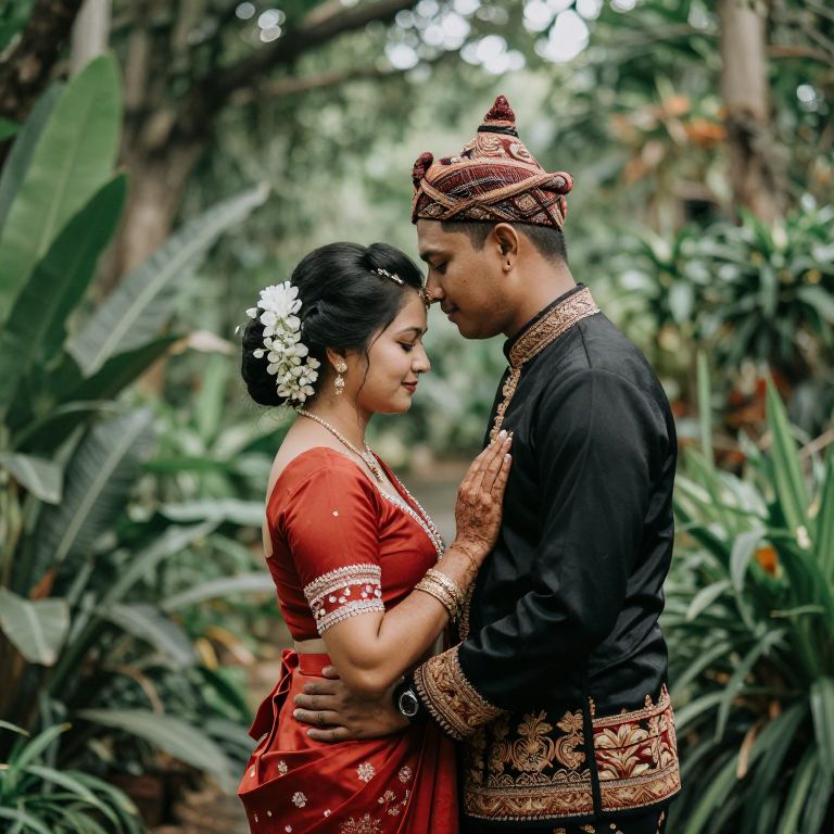 Wedding portrait featuring a couple in traditional attire surrounded by lush greenery, soft natural light filtering through the trees, intimate and emotional moment captured with fine art photography style