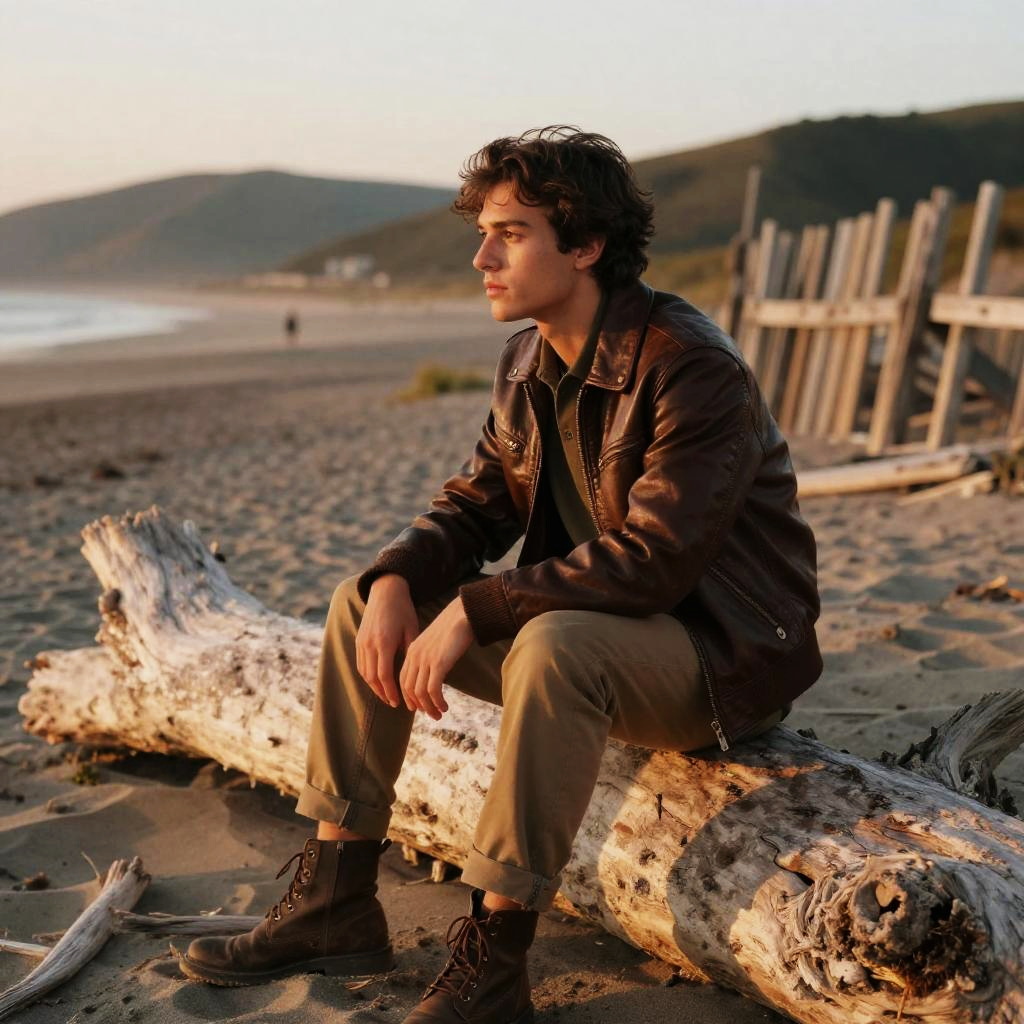 A young man with spiky black hair wearing a casual white t-shirt and dark denim jeans perches on a cracked concrete ledge beside a sunlit urban garden at late morning light, cinematic 35mm film look, ethereal pastel sunlight, shallow depth of field with bokeh, soft grain texture, gentle pastel tonal palette, with distant rolling hills and a weathered wooden fence in the background.