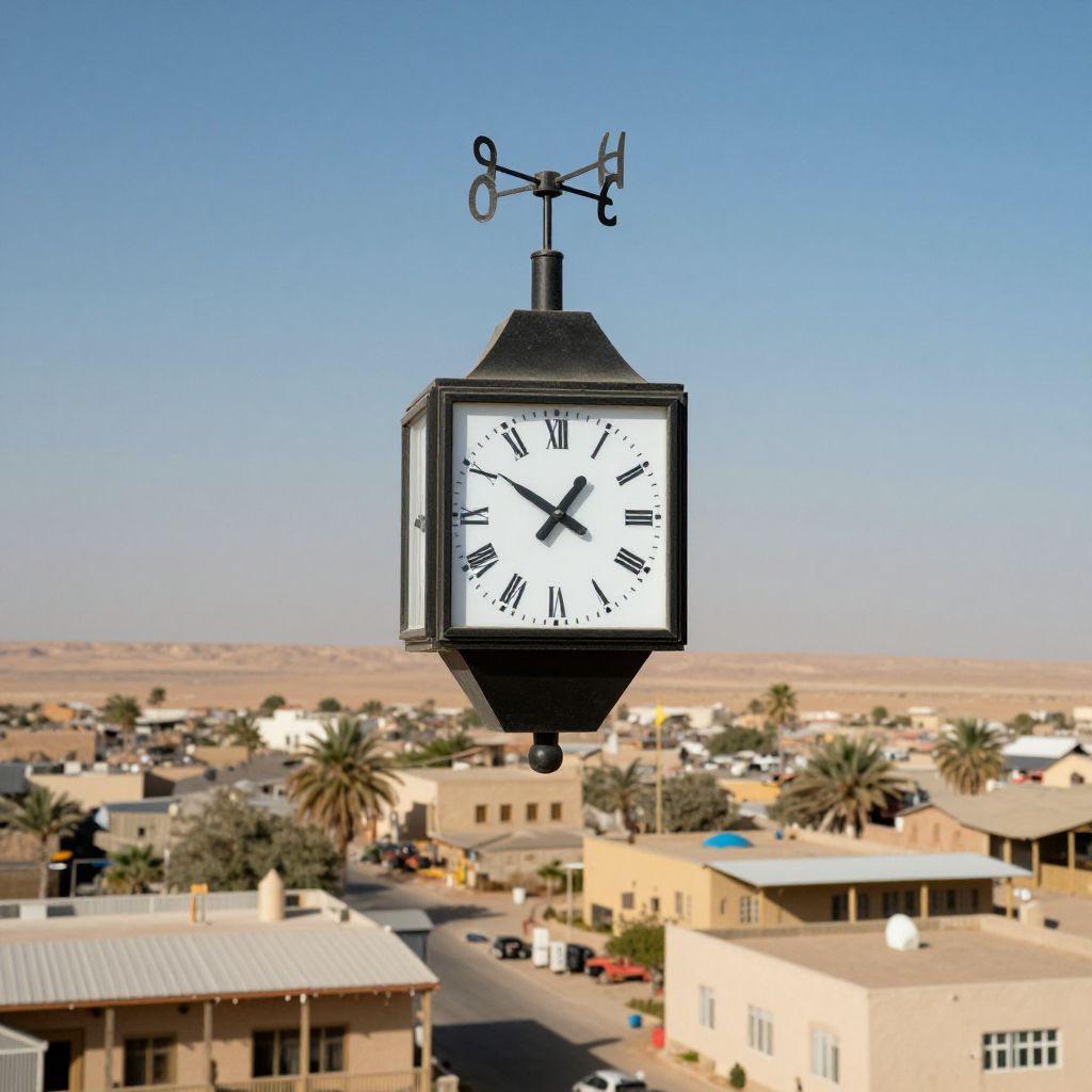 Photograph of a black, square clock with white face and black Roman numerals, mounted on a black pole with a weather vane on top, set against a clear blue sky. The clock hangs above a suburban area with beige and white buildings, palm trees, and distant desert landscape. The buildings have flat roofs and are arranged in a grid-like pattern. The clock's hands show 10:09. The background features a horizon of barren land, highlighting the arid environment.