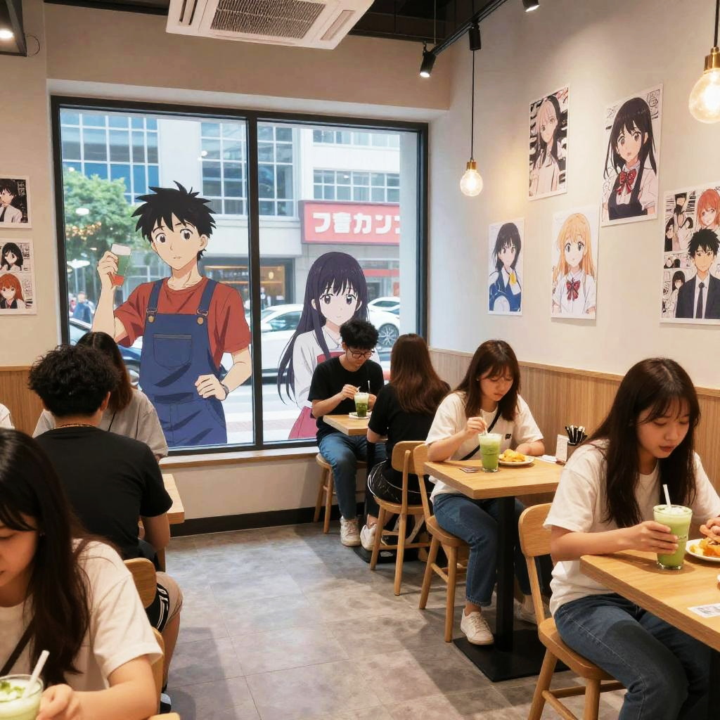 Anime cafe Atlanta interior with patrons enjoying matcha lattes, large windows showing cityscape, anime art style, soft lighting, manga posters on walls, charming and lively ambiance