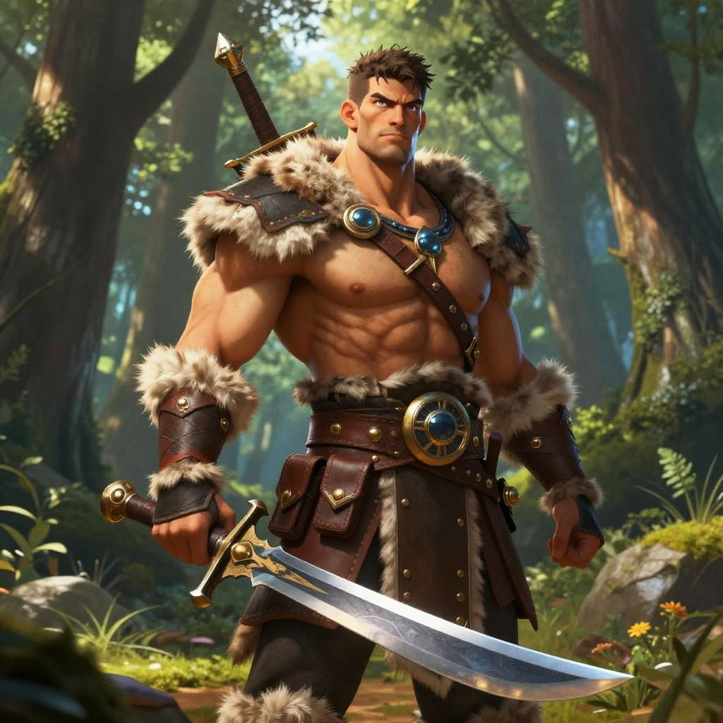 A muscular warrior stands confidently in a dense forest, wielding a large, curved sword and a secondary weapon strapped to his back. He wears a leather belt with pouches, fur accents on his shoulders and wrists, and a determined expression that hints at readiness for battle. The image features a detailed, fantasy-inspired digital art style with vibrant colors and intricate costume design.