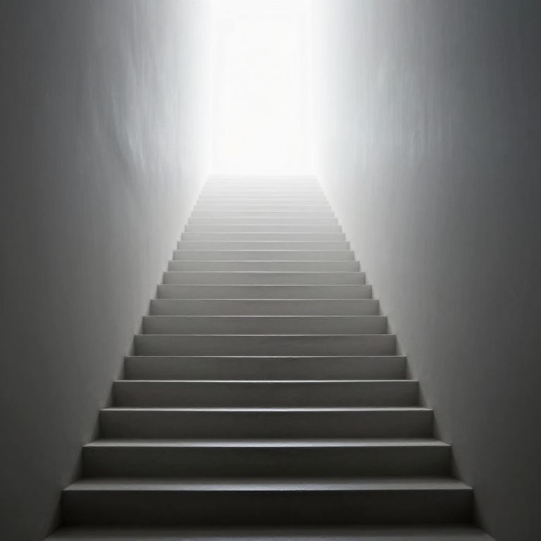 An ethereal staircase ascends toward a luminous void, inviting introspection and symbolizing the journey from the tangible to the infinite, where light whispers of hope and shadows echo the weight of contemplation.