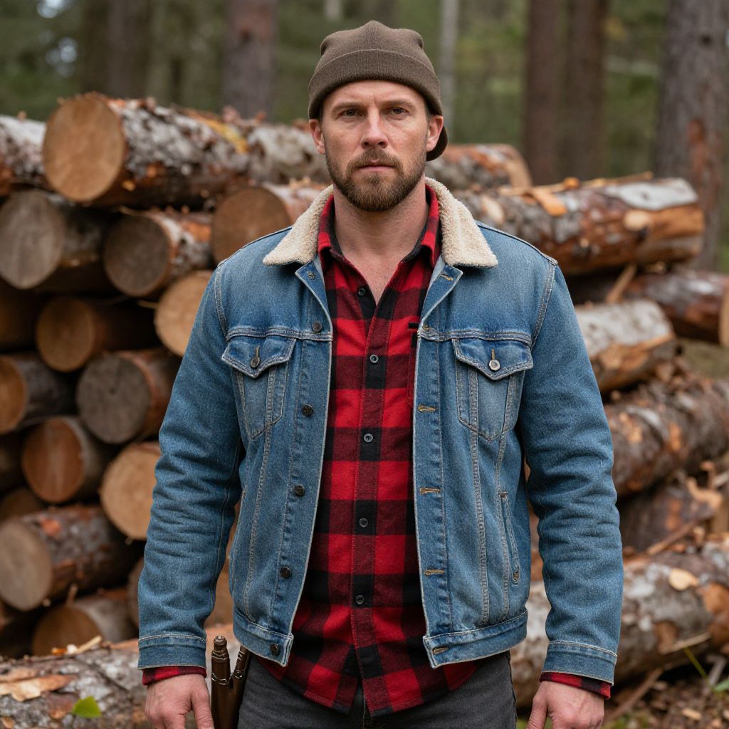 A rugged man dressed in a classic lumberjack costume, featuring a red and black plaid shirt layered over a denim jacket and a brown cap, stands confidently in a forest setting with stacks of logs behind him. The photograph captures a cinematic realism style, emphasizing strong facial features and a natural outdoor environment.