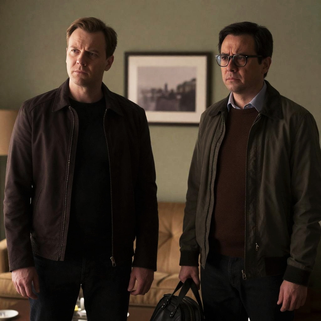 Photograph of two men in a room. One man stands, hands clasped, wearing a gray tweed jacket, gray tie, and light blue shirt. He has short brown hair, serious expression. The other man, seated, wears a light gray jacket, white shirt, and dark tie, looking down at a camera. Background has a detailed, sepia-toned tapestry of a village scene. A white wall with a sconce is on the right.