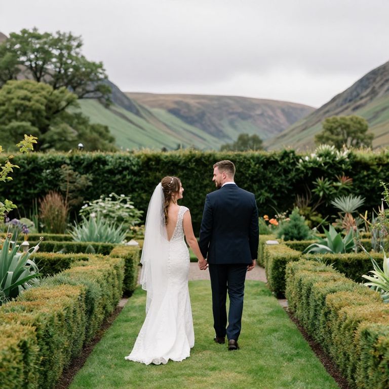 Photograph of a bride and groom standing in a formal garden, viewed from behind. The bride wears a white, sleeveless, lace wedding dress with a long, flowing veil, and her long brown hair is down. The groom is in a black suit with a white shirt. They hold hands and walk down a narrow, well-manicured path lined with green hedges and white flowers. The background features lush, green hills under a cloudy sky. The garden is meticulously maintained, with various plants and flowers on either side of the path. The couple's attire contrasts with the natural greenery, highlighting their special moment.