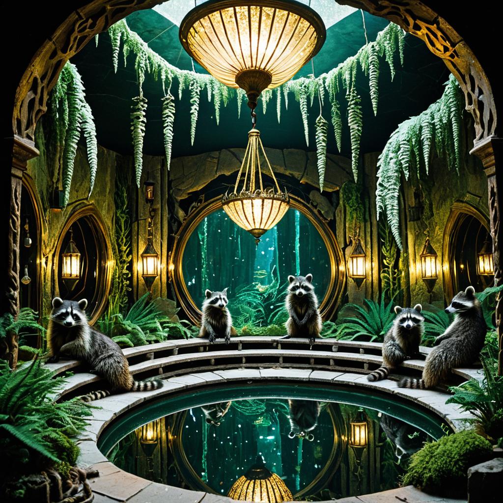Raccoons in Enchanted Crystal Cave with Mirror Pool