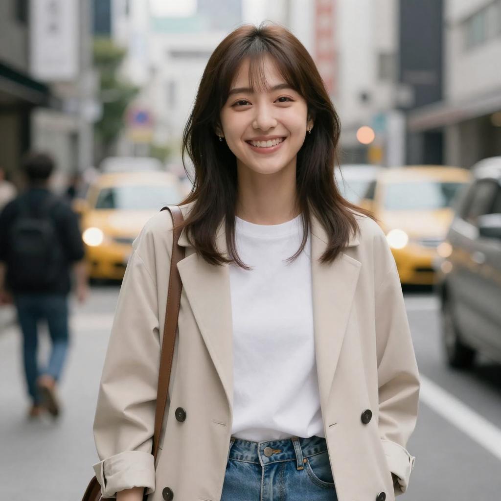 Portrait of an Asian woman with a messy bun hairstyle wearing a denim jacket embellished with rhinestones and pearl details, paired with a white silk blouse featuring pearl buttons. The image is captured with cinematic backlighting and a shallow depth of field, highlighting her thoughtful expression and fashion-forward outfit.