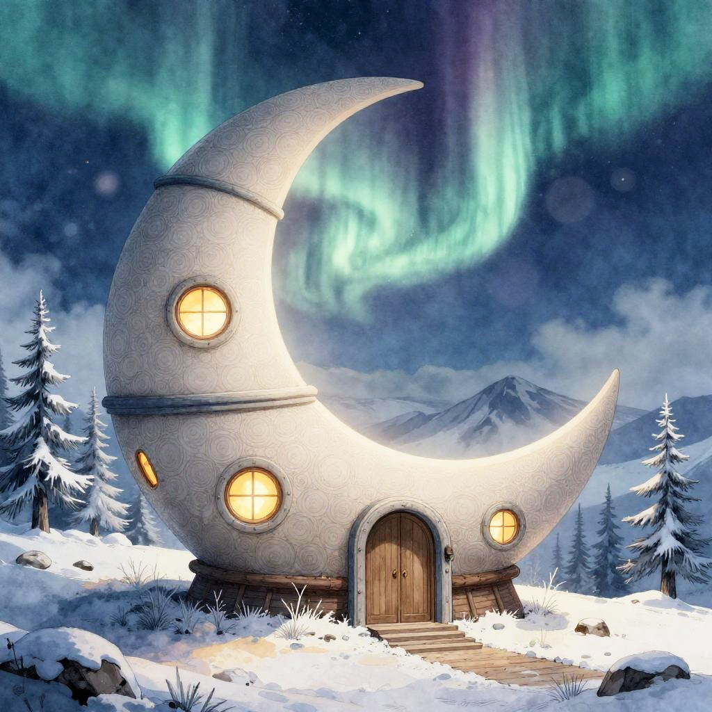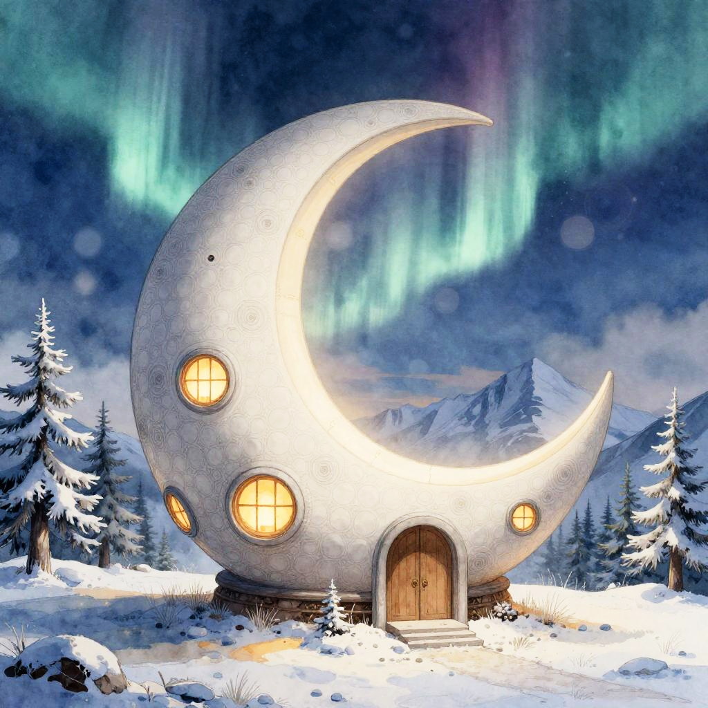 Fairy-tale cottage shaped like a glowing crescent moon, illuminated by warm lights, nestled in a snowy forest under vibrant northern lights.