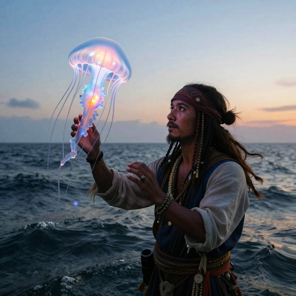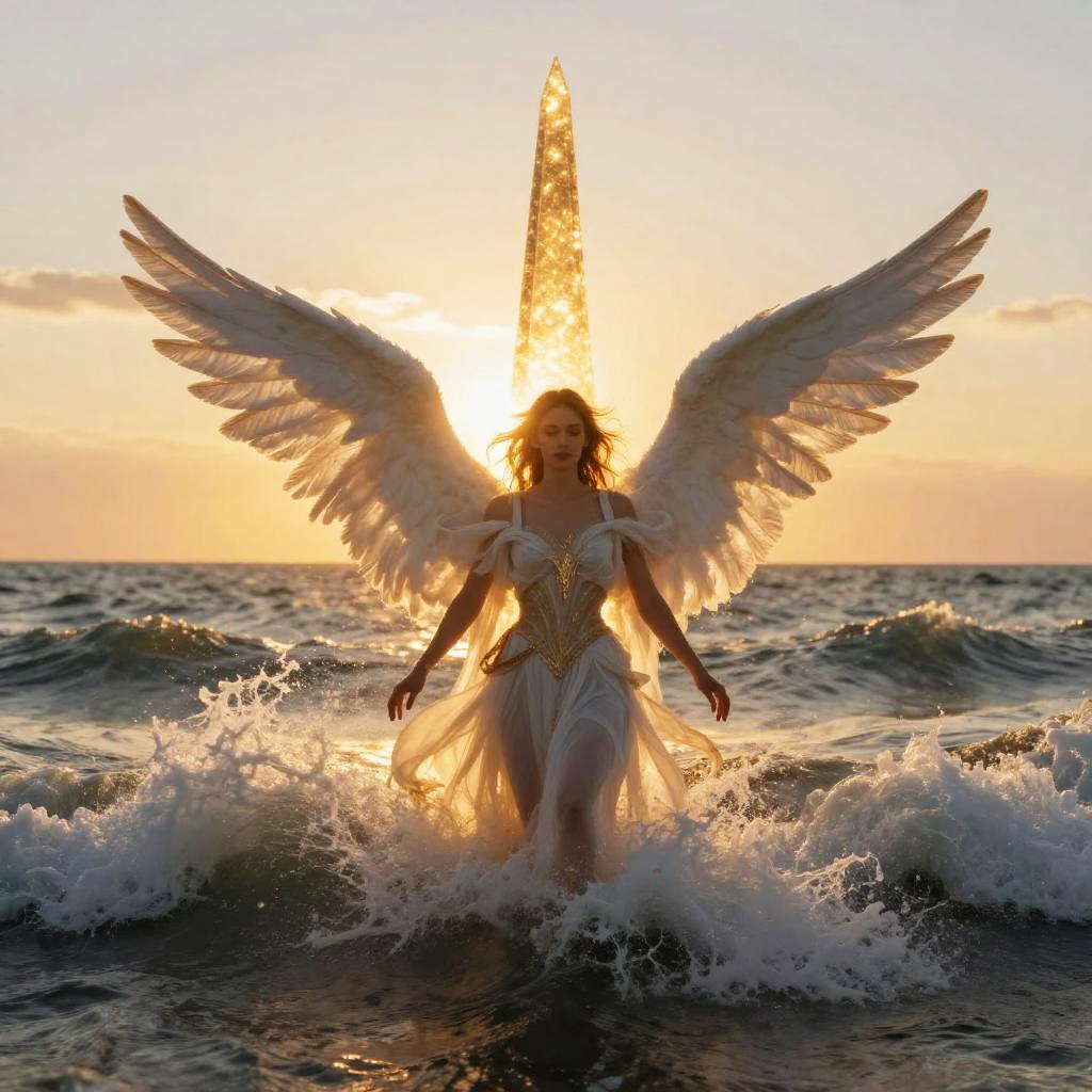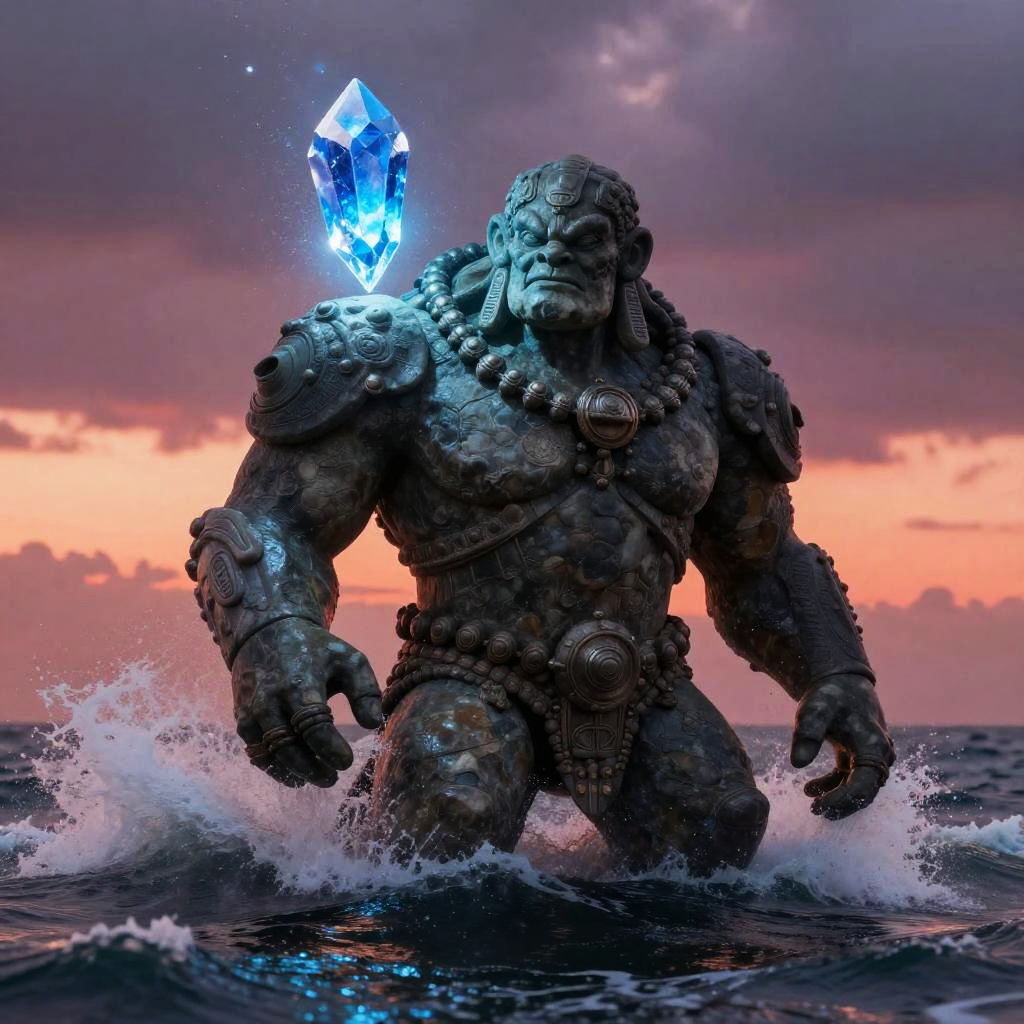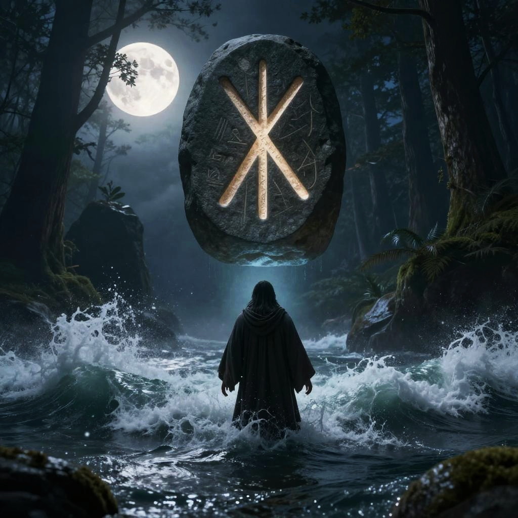 A massive thunderbird braving the tumultuous ocean waves, illuminated by the glowing moonlight, with a mystical floating rune tablet hovering above, casting ethereal light, as time intertwines in this mystical encounter.