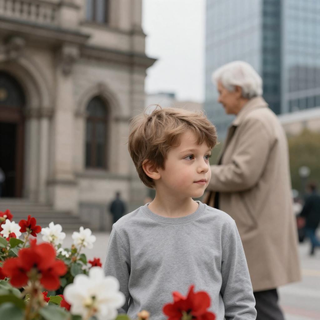 Photograph of an elderly white man with short white hair in a black shirt standing beside a young boy with short brown hair in an orange jacket, holding a camera, taking a photo. They are outdoors, with green bushes in the foreground and a blurred street with trees and a car in the background.