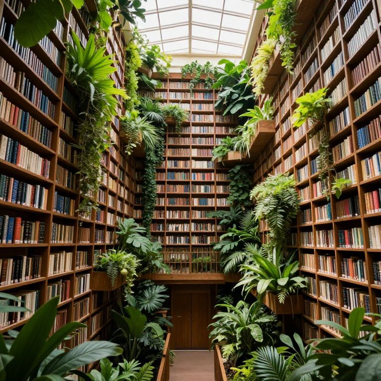 Photograph of a spacious, sunlit library with high, glass-paneled ceilings. Tall, wooden bookshelves filled with multicolored books line both sides, creating a narrow, rectangular aisle. Lush green plants, including ferns and large leaves, are interspersed throughout the shelves, adding a natural element. The wooden floor is visible at the bottom, leading to a central wooden door at the back. The light from the ceiling brightens the room, highlighting the rich, dark wood and vibrant green foliage. The overall atmosphere is serene and inviting.