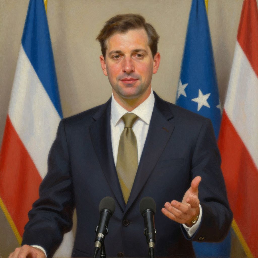 Convincing portrait of a diplomat negotiating peace, calm and confident posture, subtle smile, elegant attire, soft natural background with flags and microphones, warm and inviting colors, oil painting style with fine brush strokes