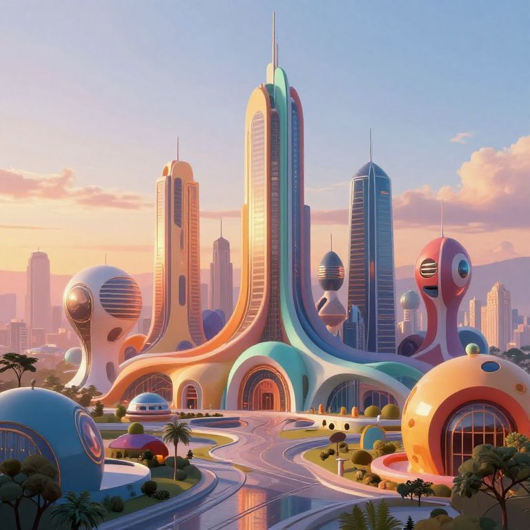 Dall-E creation portraying a futuristic cityscape made of colorful geometric shapes and smooth robotic forms, bathed in glowing sunset light, combining organic architecture with advanced technology in a harmonious, ultra-detailed digital painting.