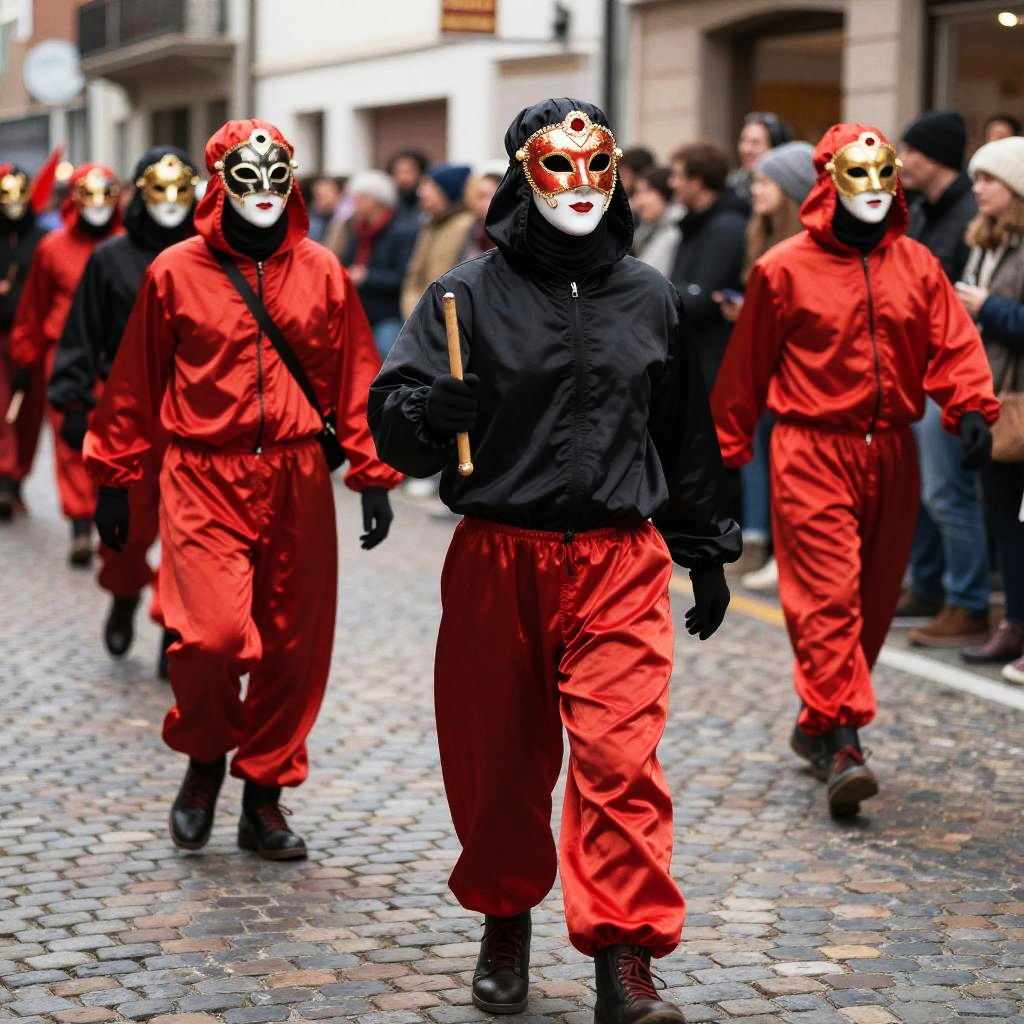 Pentaculo masked figures parading through cobblestone streets during carnival, vivid reds and glossy blacks on costumes, intricate handcrafted masks with expressive features, festive crowd watching, dynamic composition with motion blur, lively and authentic festival spirit