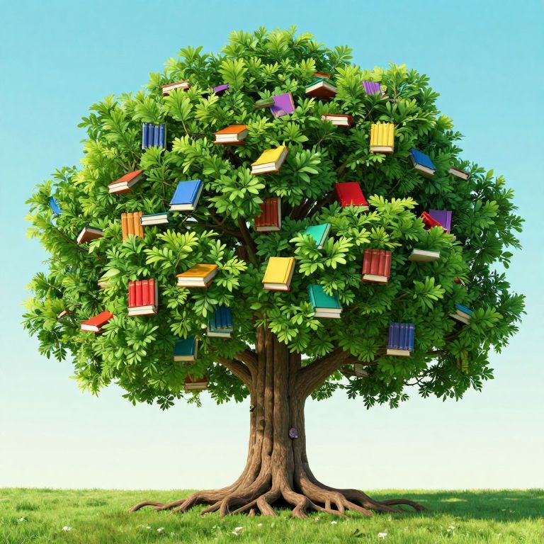 Books sprout from the branches and roots of a vibrant green tree, creating a living library where colorful volumes perch among lush foliage against a serene sky.