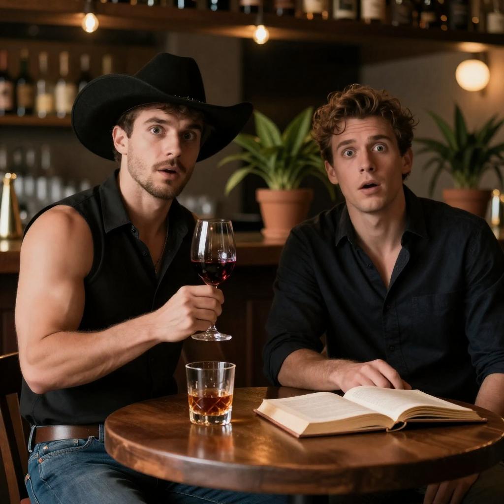Three men standing in an ornate hallway with a chandelier overhead, all mid-laugh with eyes closed. The man on the left wears a gray cowboy hat, blue suit jacket, green shirt, and jeans. The man in the center wears a blue checkered suit and white dress shirt. The man on the right wears a patterned button-up shirt with a mustache and dark pants. The scene captures a candid joyful moment with classic interior decor.
