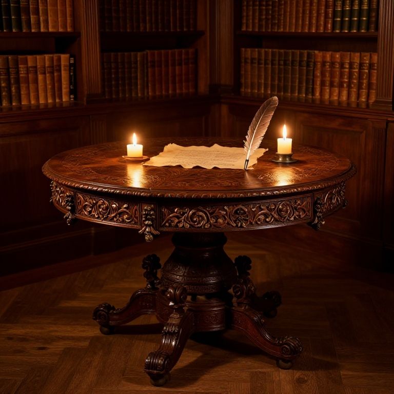 An ornate antique table carved with intricate patterns, placed in an old library full of leather-bound books, candlelight flickering on the table surface, a quill and parchment hinting at historical storytelling scene