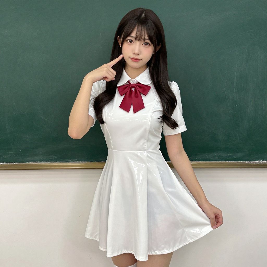 Photograph of an Asian woman with long black hair and bangs, standing in front of a green chalkboard. She is wearing a white, short-sleeved, pleated dress with a red bowtie at the collar. Her right hand is touching her cheek, with a slight, playful smile on her face. The chalkboard behind her is plain and dark green, and the lower part of the wall is white. The lighting is bright, emphasizing the shine of her dress and the smooth texture of her hair. She has a fair skin tone and a slender physique.