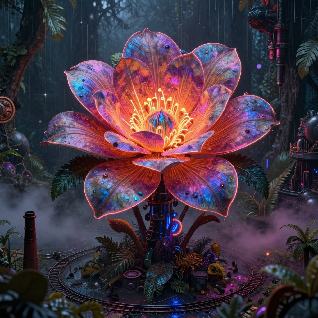 Digital neon, (large flowers) flowers, waterdrops, botanical art style, rain forest, flower, rousseau style, sf, intricate artwork masterpiece, golden ratio, trending on cgsociety, intricate, epic, trending on artstation, by artgerm, h. r. giger and beksinski, highly detailed, vibrant, production cinematic character render, ultra high quality model, Unreal Engine, cinematic, color gradation, editorial photography, photography, photoshoot, 70mm lens, depth of field, DOF, corner blur, shutter speed 1/1000, F/22, white balance, 32k, super resolution, Megapixel, ProPhoto RGB, VR, Lonely, Good, Massive, Halfrear Lighting, Backlight, Natural Lighting, Lighting, Optical Fiber, Moody Lighting, Cinematic Lighting, Studio Lighting, soft Lighting, Volumetric, Contre-Jour, Beautiful Lighting, Accent lighting, global lighting, global screen space lighting, global ray tracing lighting, optics, diffusion, isometric, digital art, smog, pollution, toxic waste, chimneys and railroads, 3 d render, octane render, volumetrics, by greg rutkowski, neon ambiance, abstract black oil, gear mecha, detailed acrylic, grunge, intricate complexity, rendered in unreal engine, photorealistic