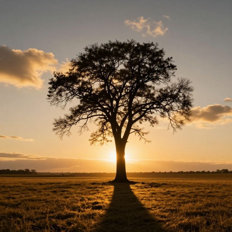 Photograph of a solitary, large tree standing in calm ocean waters during sunset. The tree, with a thick trunk and expansive, leafy branches, is silhouetted against a vibrant sky transitioning from orange to blue. The sun, partially obscured by the tree's branches, casts a golden reflection on the water's surface, creating ripples that mirror the sky's colors. The scene exudes tranquility and natural beauty, with the tree centrally positioned and the horizon blending seamlessly into the sky.