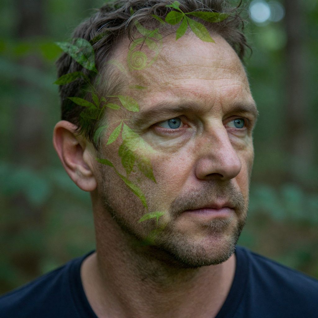 A captivating double exposure portrait showcases a middle-aged man's enigmatic gaze, his piercing blue eyes and rugged features partially veiled by an overlay of swirling green leaves. These vibrant foliage patterns emerge from his weathered skin, mimicking the texture of his five o'clock shadow as they seamlessly merge with the surrounding forest. With a mix of contemplation and resolve in his off-camera glance, this image artfully blends nature's raw beauty with human resilience, inviting viewers to ponder the intricate relationship between man and wilderness.
