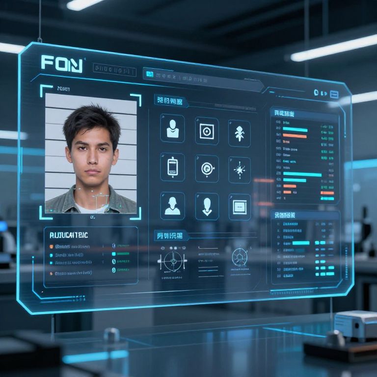 Mugshot creator software interface, futuristic digital police database, sleek modern UI with biometric scanning, neon lights reflecting on glass screen, cyberpunk style, detailed icons and data panels, high-tech crime lab environment