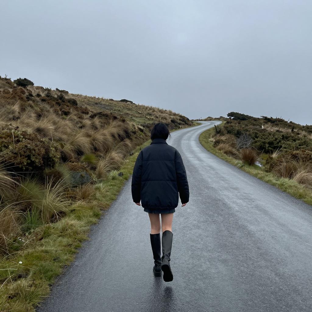 A person dressed in a dark coat, knee-length skirt, knee-high socks, and boots walking away on a wet, narrow road through a hilly grassy landscape with low shrubs. The overcast sky adds a moody atmosphere as the road curves to the right and disappears into the distance.