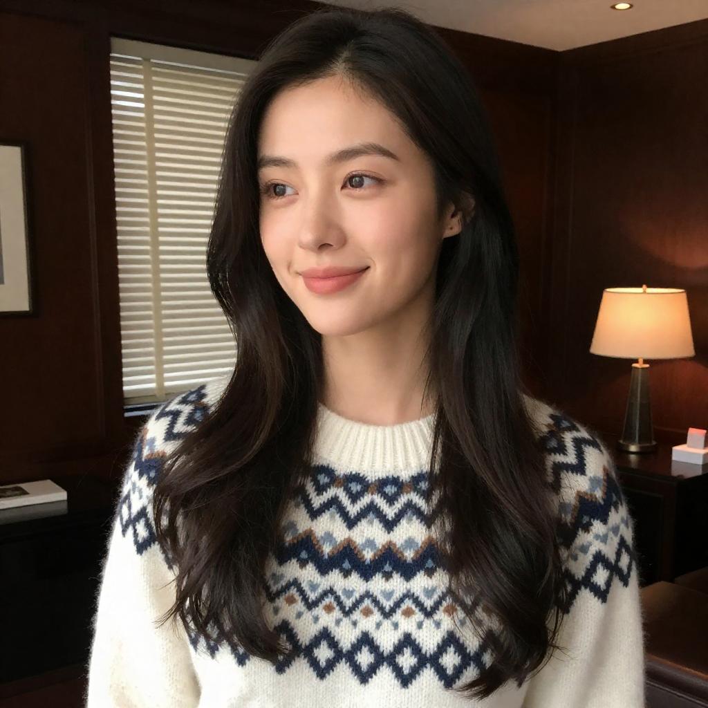 Photograph of a woman with long, wavy dark hair wearing a white, patterned sweater, looking slightly to the side with a subtle smile. She is indoors with dark wooden walls, a window with blinds, and a lamp on a table in the background. Soft light illuminates her face from the left.