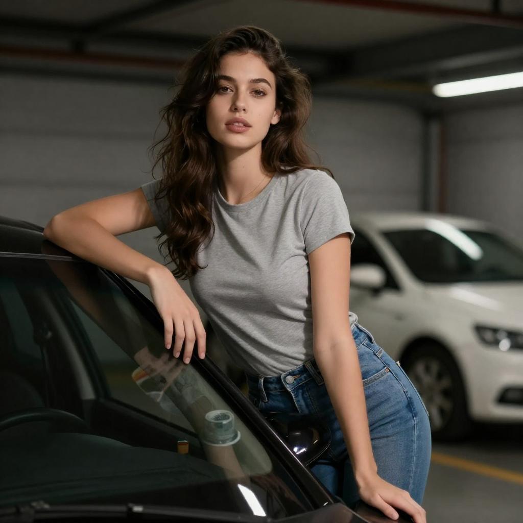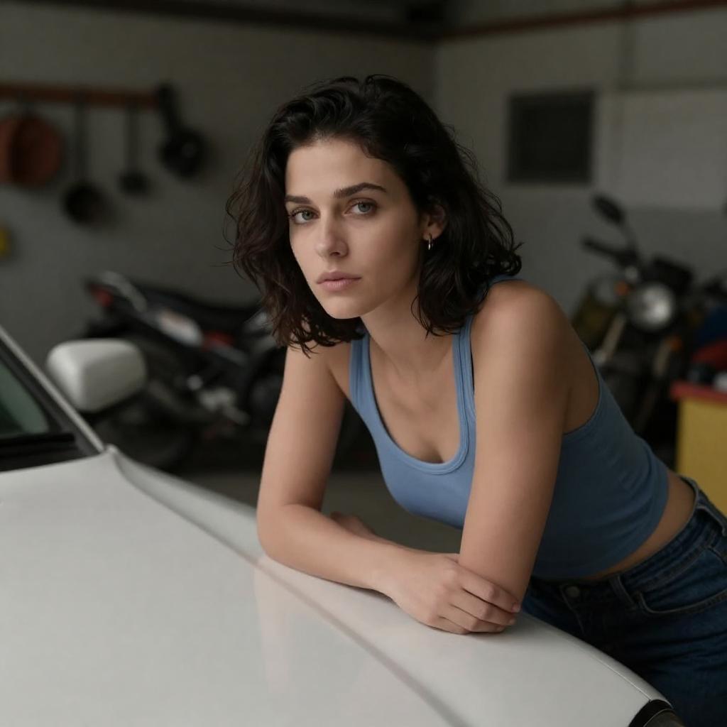 Photograph of a slender woman with long, wavy brown hair, wearing a gray sleeveless top and blue jeans, leaning against a black and white racing car in a dimly lit garage. She wears brown boots and gazes confidently at the camera. The background includes workshop tools and equipment.
