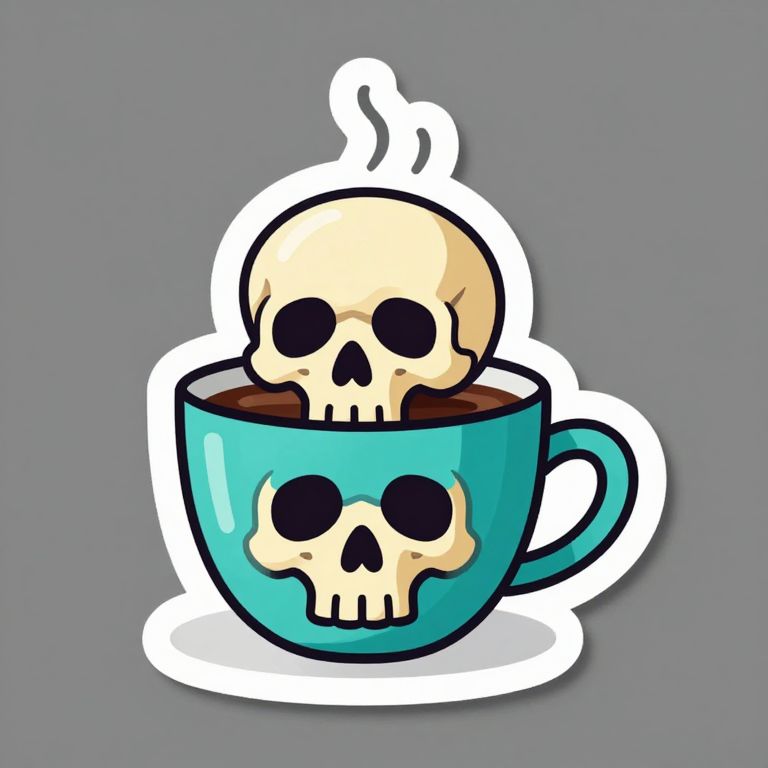 The image features a sticker in vector style, depicting a steaming cup of coffee with a skull inside it. The skull is detailed with a light yellowish-brown hue, showcasing its intricate bone structure and dark eye sockets. The cup is a vibrant turquoise color, with steam rising from it, adding a dynamic element to the scene. The overall composition is balanced, with the skull and cup centrally aligned, creating a harmonious visual effect. The background is a muted gray, which contrasts with the vivid colors of the skull and cup, making them stand out prominently. The sticker has a rough, textured appearance, giving it a tactile quality. The design is both cute and intriguing, blending elements of caffeine and mortality in a playful yet thought-provoking manner.
